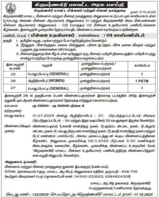கிருஷ்ணகிரி மாவட்ட மீன்வளம் மற்றும் மீனவர் நலத்துறை அலுவலக கட்டுப்பாட்டில் காலியாக உள்ள மீன்வள உதவியாளர் பணியிடங்களை நிரப்ப வேலை வாய்ப்பு அறிவிப்பு வெளியிடப்பட்டுள்ளது. மொத்தம் 3 பணியிடங்கள் நிரப்பப்பட உள்ளன. இந்த பணியிடங்கள் நேரடி நியமனம் அடிப்படையில் நிரப்பப்பட உள்ளன. தகுதியும் விருப்பமும் உள்ளவர்கள் 05.11.2025க்குள் விண்ணப்பித்துக் கொள்ளுங்கள்.