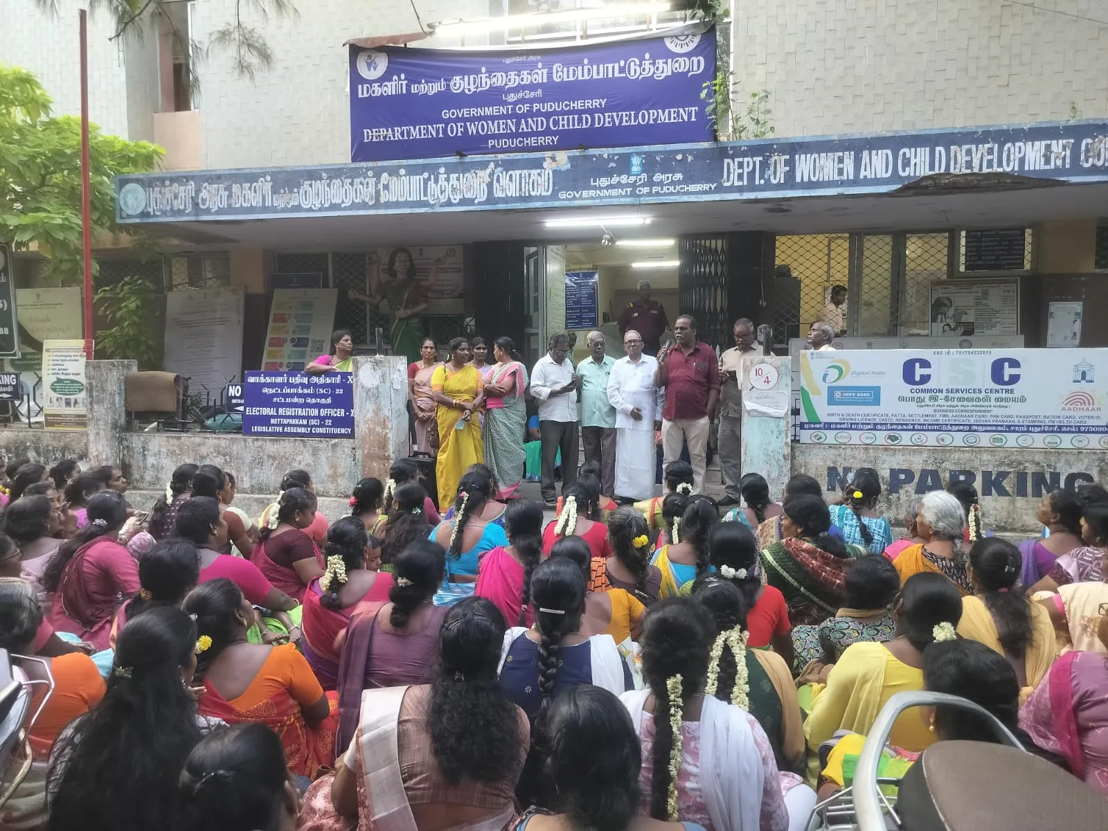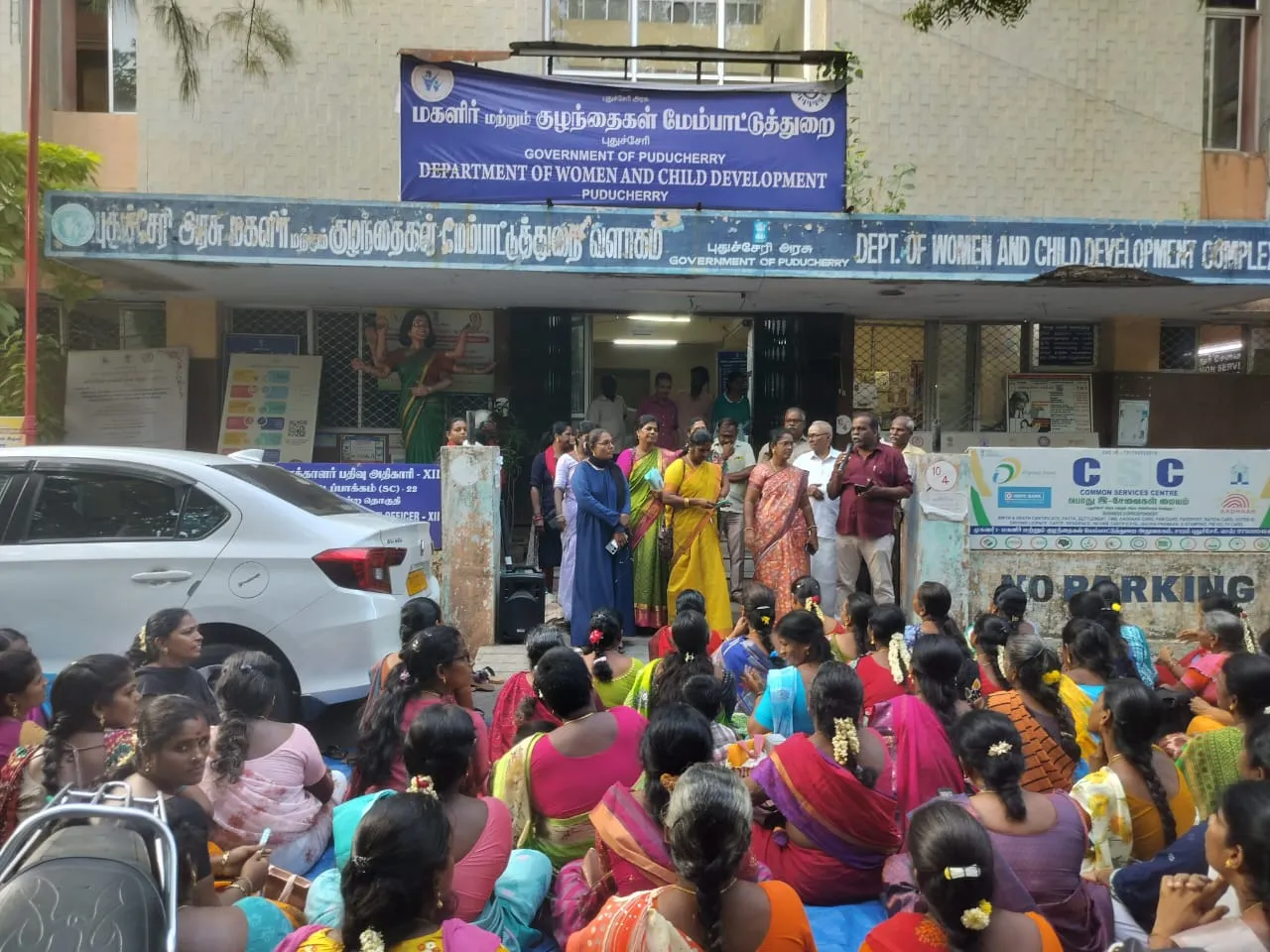 5 அம்ச கோரிக்கைகளை வலியுறுத்தி, மகளிர் மற்றும் குழந்தைகள் மேம்பாட்டு துறை அலுவலகம் முன்பு புதுச்சேரி அங்கன்வாடி ஊழியர்கள் சங்கத்தின் சார்பில் கவன ஈர்ப்பு ஆர்ப்பாட்டம் நடைபெற்றது.